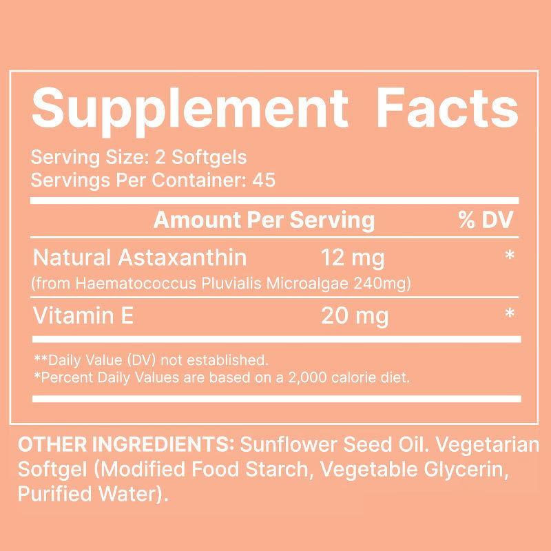 12mg astaxanthin alami + 20mg vitamin E menciptakan jaringan antioksidan larut dalam lipid untuk perlindungan 3x lebih lama.