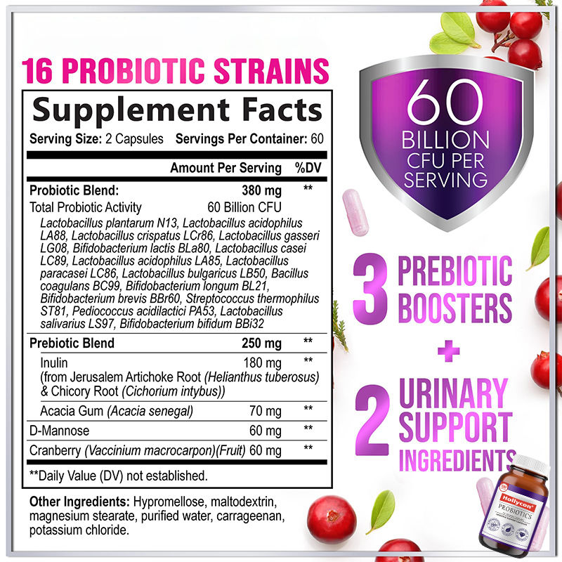 Label Pabrik Kapsul Dukungan Pencernaan Suplemen Prebiotik dan Cranberry untuk Wanita Menggunakan Campuran Probiotik yang Kuat
