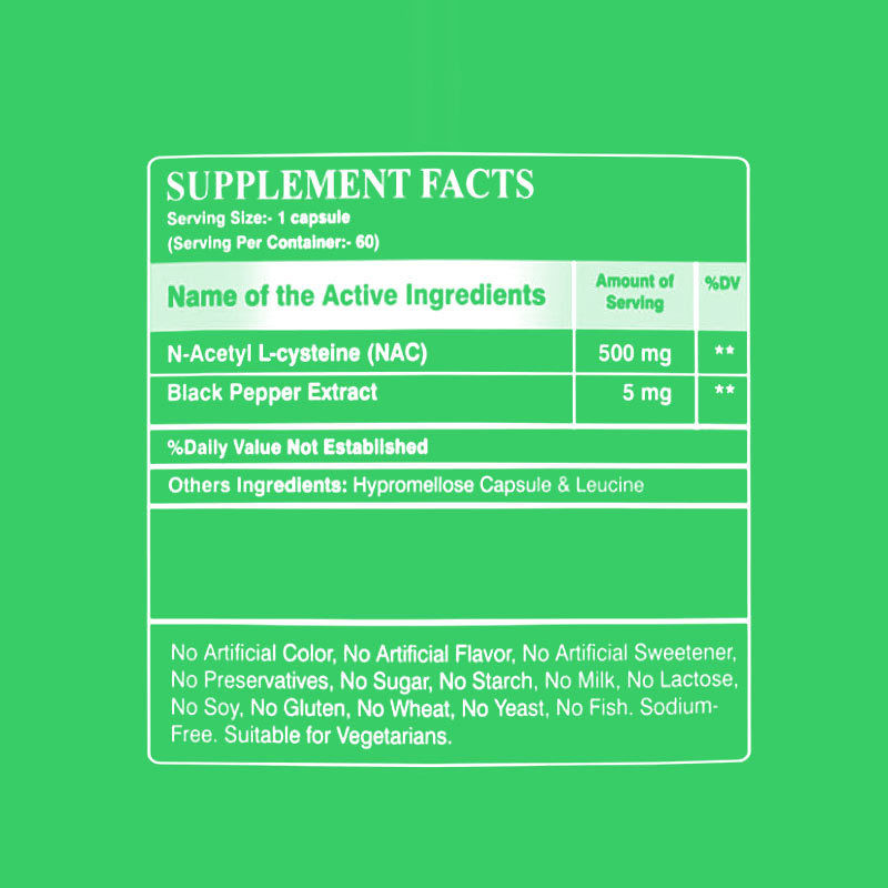 Ditingkatkan dengan Ekstrak Lada Hitam: Diformulasikan dengan 5 mg Piperine untuk mengoptimalkan penyerapan NAC, memastikan Anda mendapatkan manfaat maksimal dalam setiap dosis.