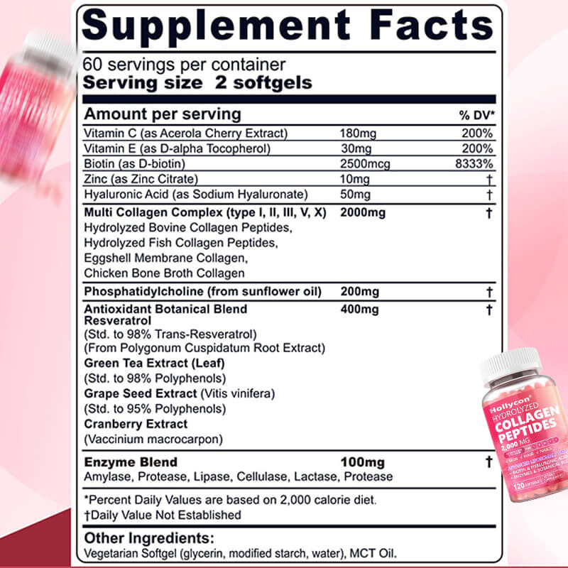 Softgel kolagen kami diperkaya dengan 4 campuran tumbuhan organik dan vitamin C, E, biotin dan seng untuk lebih meningkatkan antioksidan, serta bahan pendukung pencernaan & pemecahan untuk meningkatkan penyerapan yang efektif.
